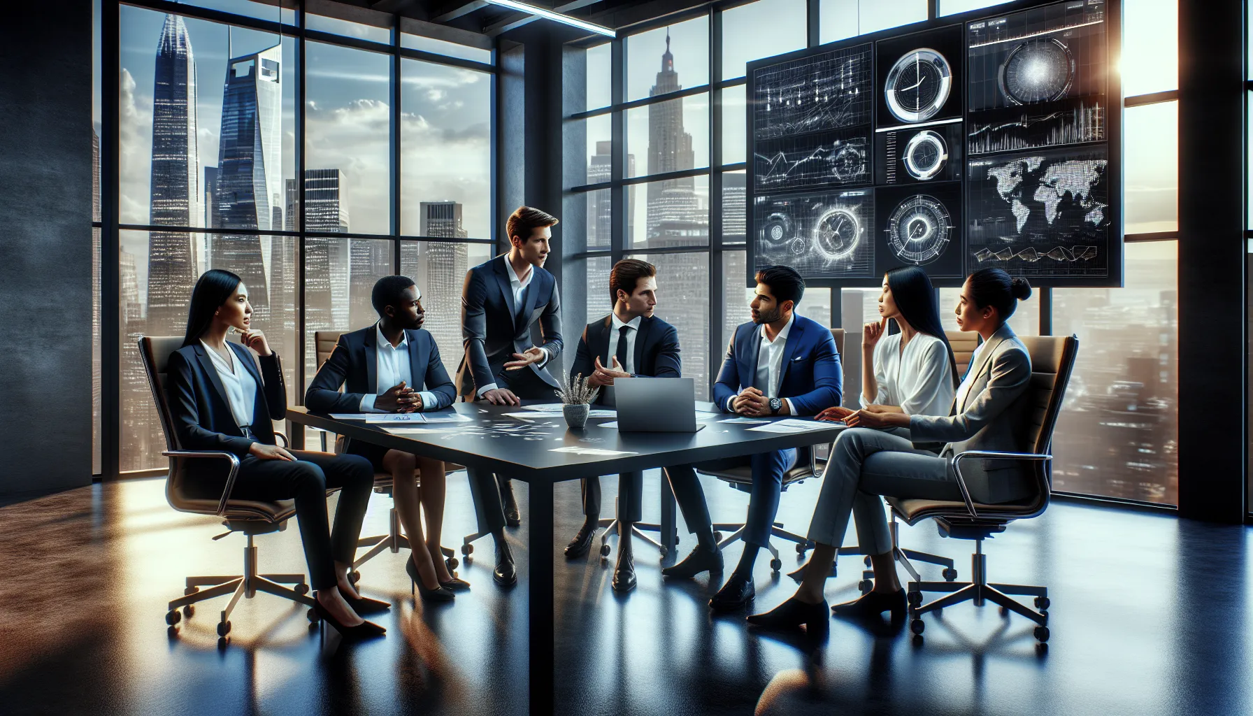 diverse professionals discussing pentachronism in a modern office.
